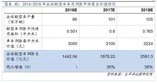 目前车用每平方米平均价值3000元(数据来源:产业链调研),通过测算,车用PCB市场 2016-2018年需求价值量有望达1442、1878、2591亿元,复合增速约34%。我们对车用PCB的市场规模测算如下。