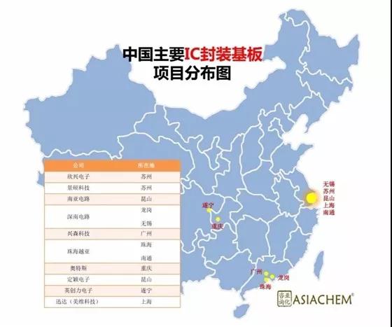 中国大陆市场主要由三家台湾企业、一家奥地利公司、三家大陆企业主导:台湾UMTC(欣兴电子)、Kinsus(景硕)、和南亚电路板在苏州和昆山设有IC封装基板工厂,奥特斯在重庆设有IC封装基板项目。大陆本土企业深南电路、兴森科技、珠海越亚分别在深圳龙岗、无锡、珠海、南通等地设厂或投资新项目。