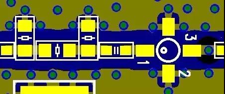(6)对某些敏感电路、有强烈辐射源的电路分别放在屏蔽腔内,装配时屏蔽腔压在PCB表面。汽车线路板在设计时要加上“过孔屏蔽墙”,就是在PCB上与屏蔽腔壁紧贴的部位加上接地的过孔。如下图12所示,要有两排以上的过孔,两排过孔相互错开,同一排的过孔间距在100mils左右。