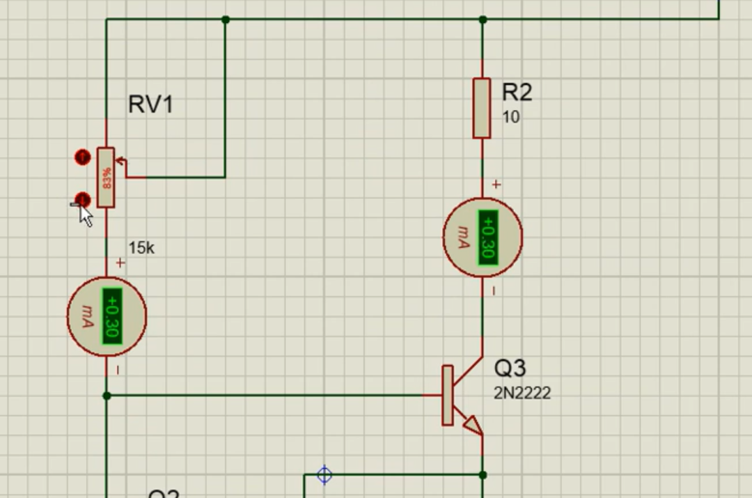 其中选取的BJT皆为相同规格的2N2222。此处的电位计用于改变Q2的集极电流,从而进一步改变了Q3的基极电流,至于输出负载,此处选取了10Ω的电阻。
