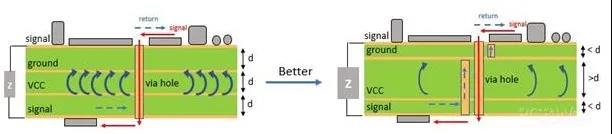 但是,有如下缺点。我们应该注意主要是由接地平面的不连续性造成的分割地面的串扰和环路区域。下图显示了两个分开的接地平面的示例。在左侧,返回电流无法沿着信号走线直接通过,因此会出现环路区域,而不会在右侧环路区域进行设计。
