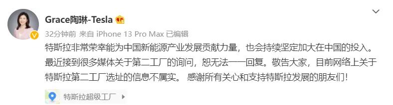 对此,特斯拉对外事务副总裁陶琳在11月3日晚间发布微博表示,最近接到很多媒体关于第二工厂的询问。恕无法一一回复,敬告大家,目前网络上关于特斯拉第二工厂选址的信息不属实。