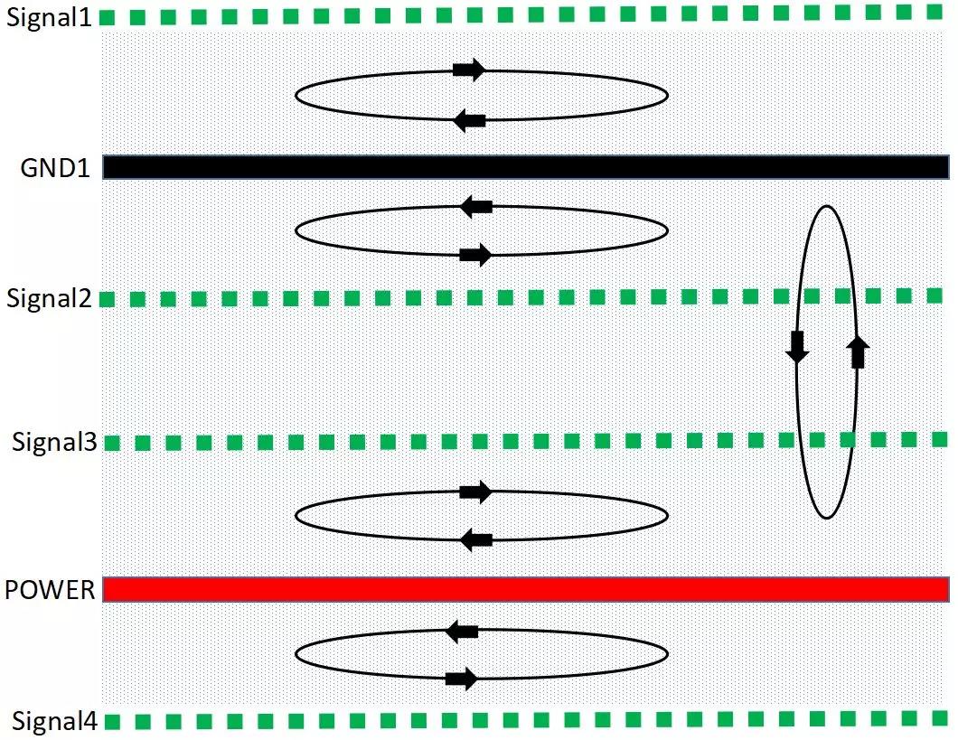 由于信号层与回流参考平面相邻,S1、S2、S3相邻地平面,有最佳的磁通抵消效果,优选布线层S2,其次S3、S1。