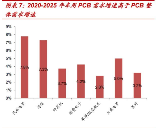 全球车用PCB 需求增速高于 PCB 整体需求。根据 Prismark 数据,车 用PCB需求将从2020年65亿美元提升至2025年的95亿美元,CAGR 为 7.6%,高于 PCB 整体增速 1.8pct,预计车用 PCB 占比将从 2020 年的 10%提升至 2025 年将为 11%。