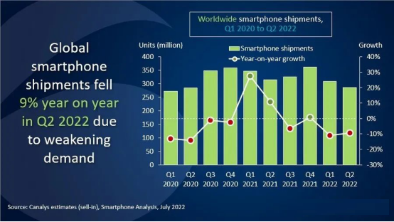 据深联电路指纹识别软硬结合板小编了解,根据Canalys发布的新数据显示,2022年二季度全球智能手机出货量同比下降9%,跌破3亿台,手机出货量已经连续两个季度下降。