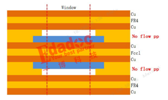 在软硬结合板生产之前先要把软板区域的不流胶PP给铣掉,形成空腔。防止在压合时,把需要露出的FPC区域给粘结一起。如下图所示: