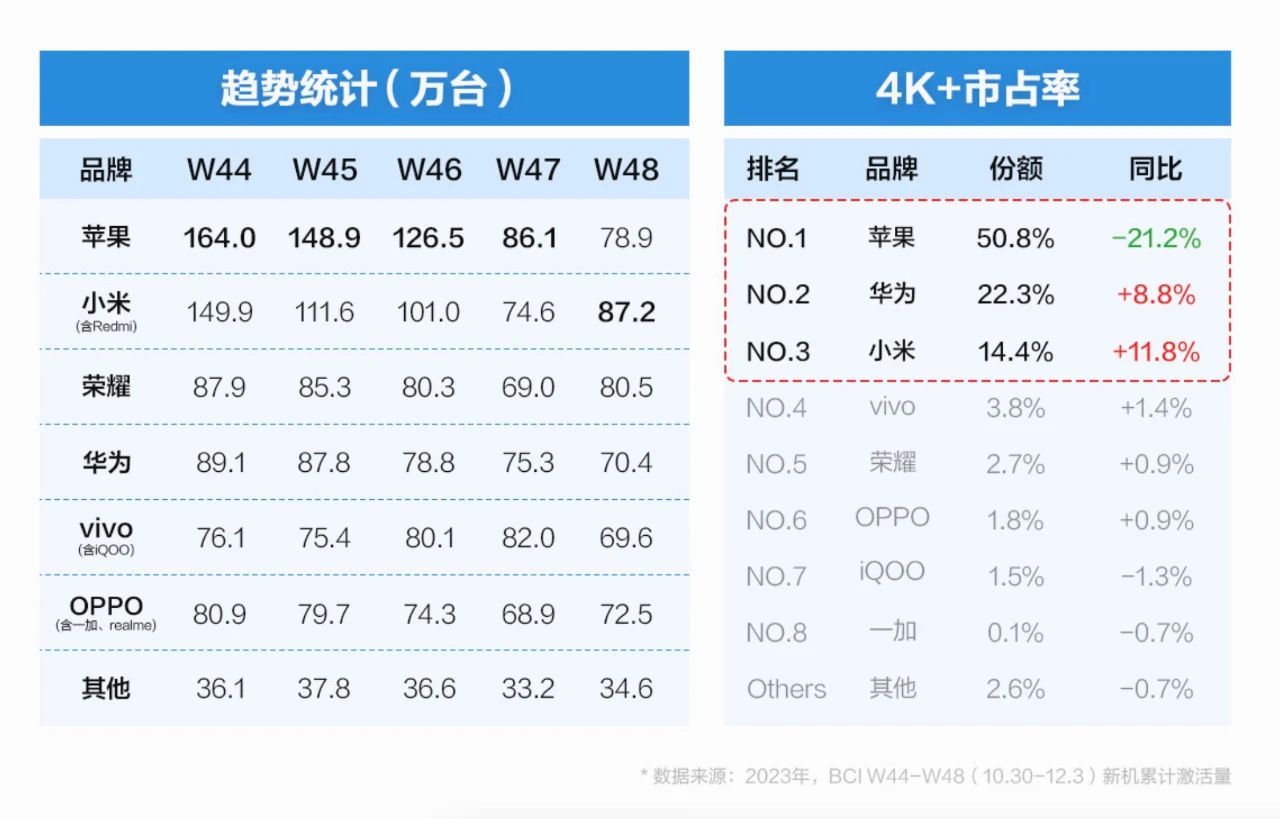 BCI还公布了11月份4K+的市占率,也就是4000元以上价位的高端手机市场占有率排行。