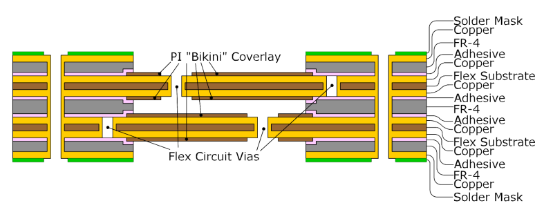 柔性电路板是与硬质电路板和其他柔性板,通过粘接剂热压在一起的。每个柔性板彼此是不相邻的。为了保持灵活性,每个柔性板最多有2个铜皮层。柔性板之间是被硬质半固化片、基板或者由环氧树脂或和丙烯酸酯胶粘剂制成的PI芯粘接片所分离的。