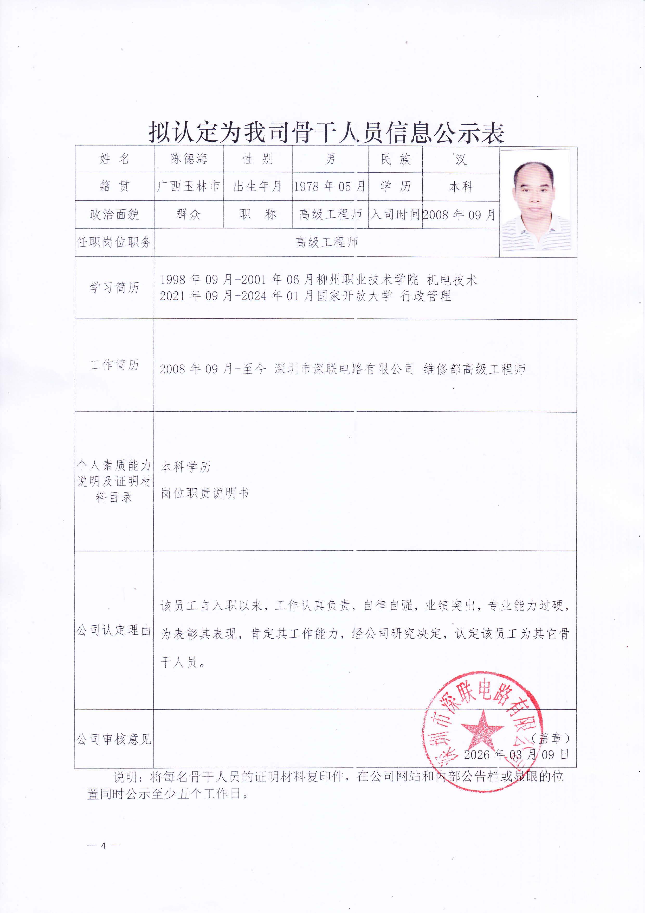 关于认定陈德海同志为我司骨干人员的公示