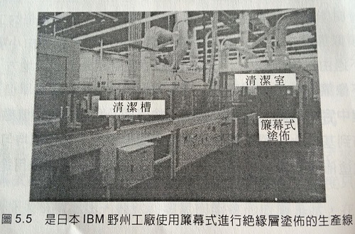 图5.5是日本IBM野州工厂使用帘幕式进行绝缘层涂布的生产线。电路板基板通过的部分为洁净室通道。在洁净室内进行帘幕式涂布的制程。